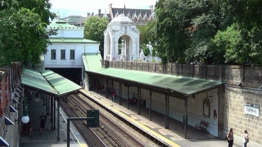 The U4 line subway station Stadtpark, next to the Hotel Intercontinental, the Ritz-Carlton and the Konzerthaus. This is a V type train, operated since the year 2000.