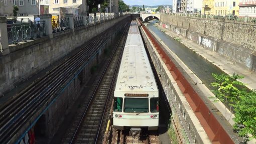 The subway line U4 going westwards (leaving the camera position), between the stations Schönbrunn and Pilgramgasse. This is a train of the U type series, delivered from 1986.