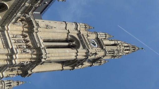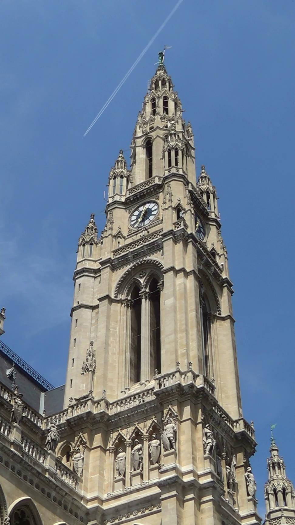 Roof and towers of the Rathaus (Town Hall). An airplane crosses the scene. This is a panorama from the left to the right. UNESCO World Cultural Heritage Site.