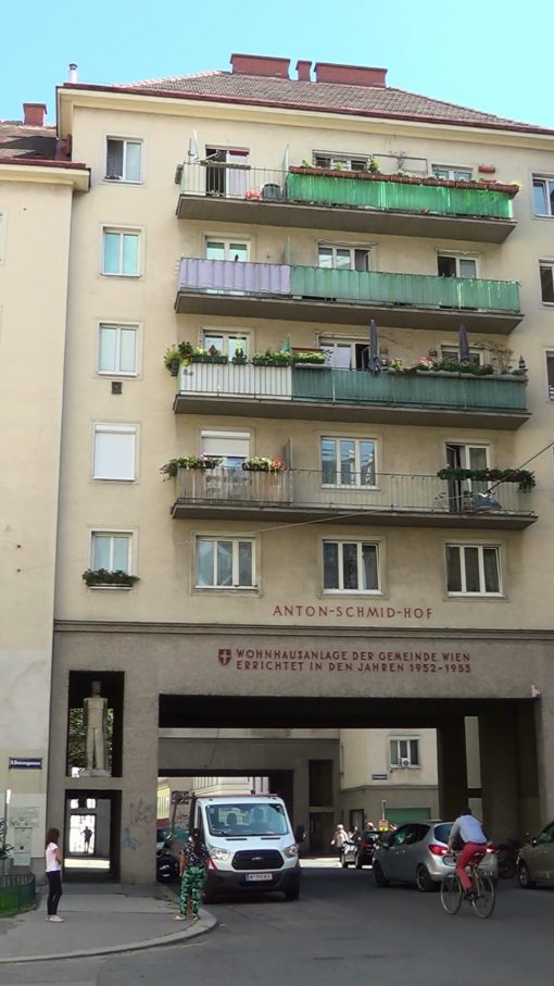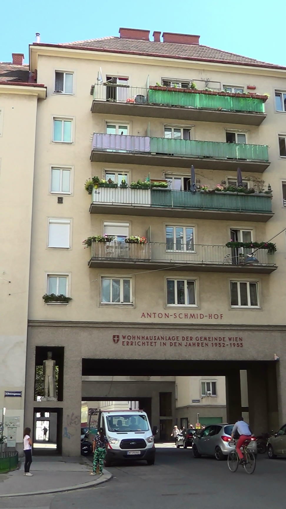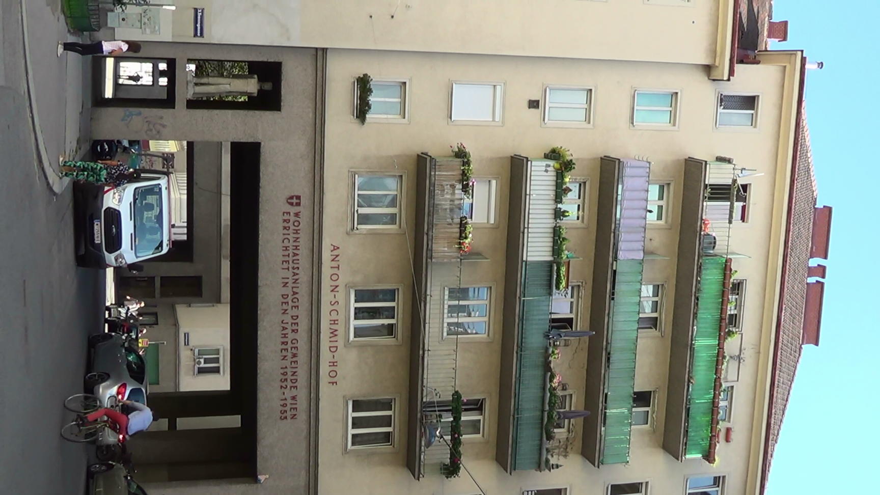A typical viennese municipality owned housing complex, the Anton-Schmid-Hof in the 3rd district. This is a panorama from the right to the left.