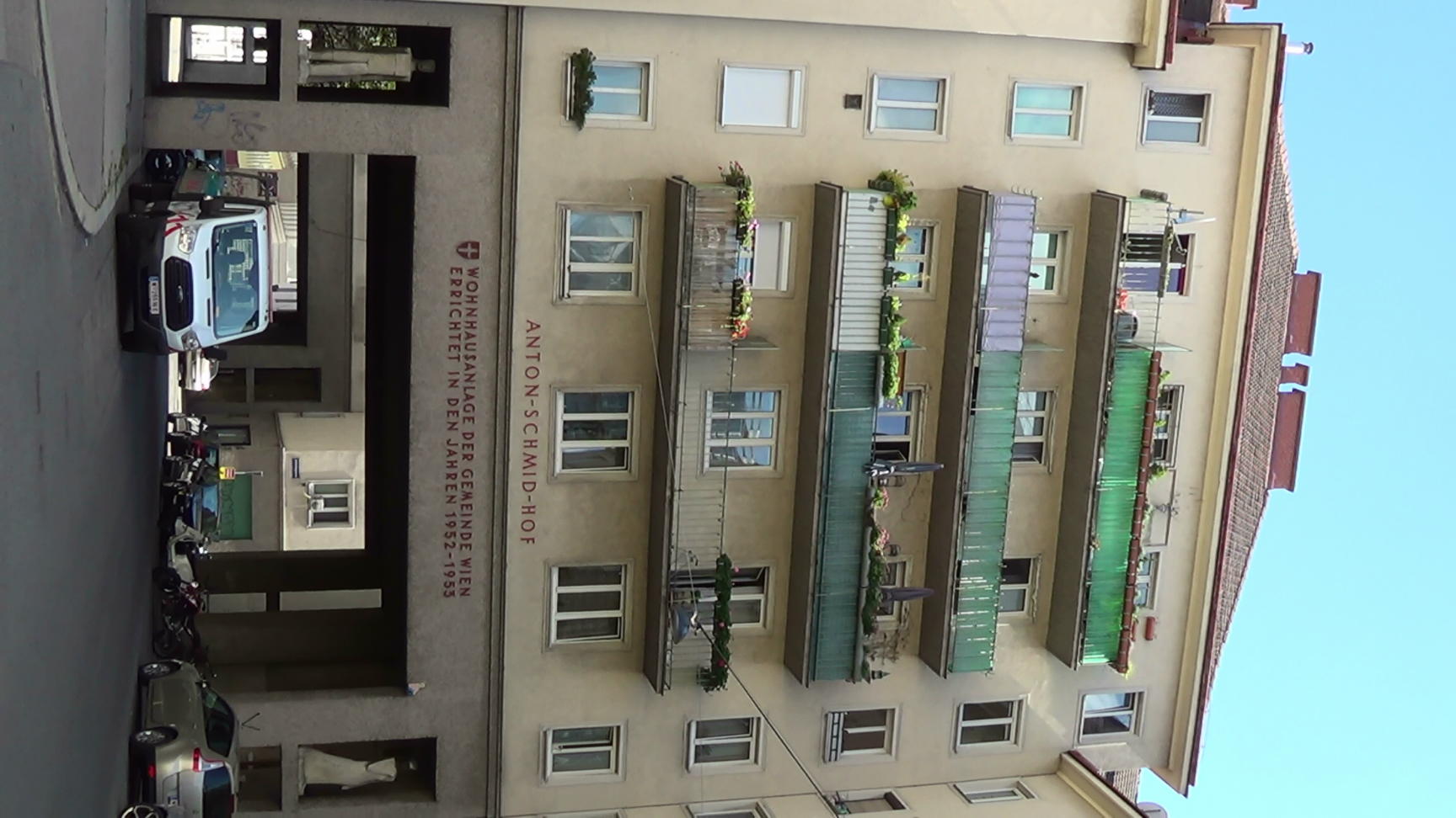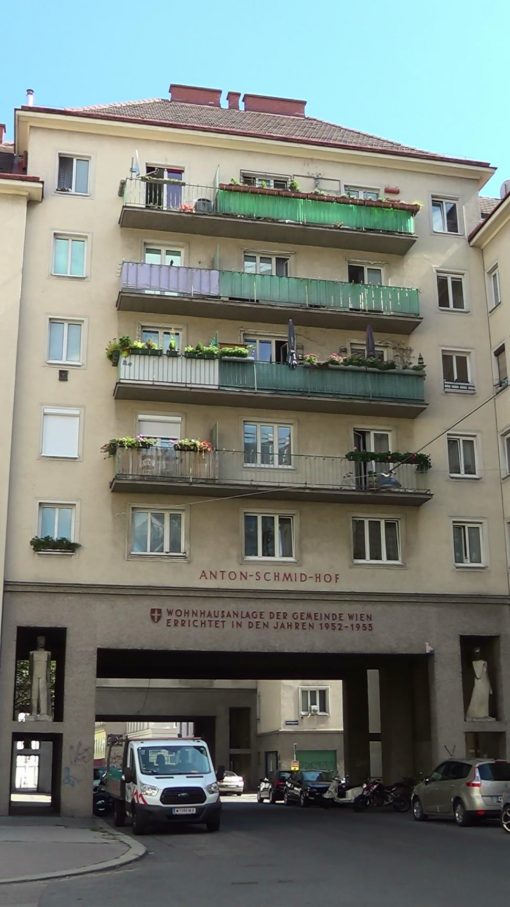 A typical viennese municipality owned housing complex, the Anton-Schmid-Hof in the 3rd district. This is a panorama from the left to the right.