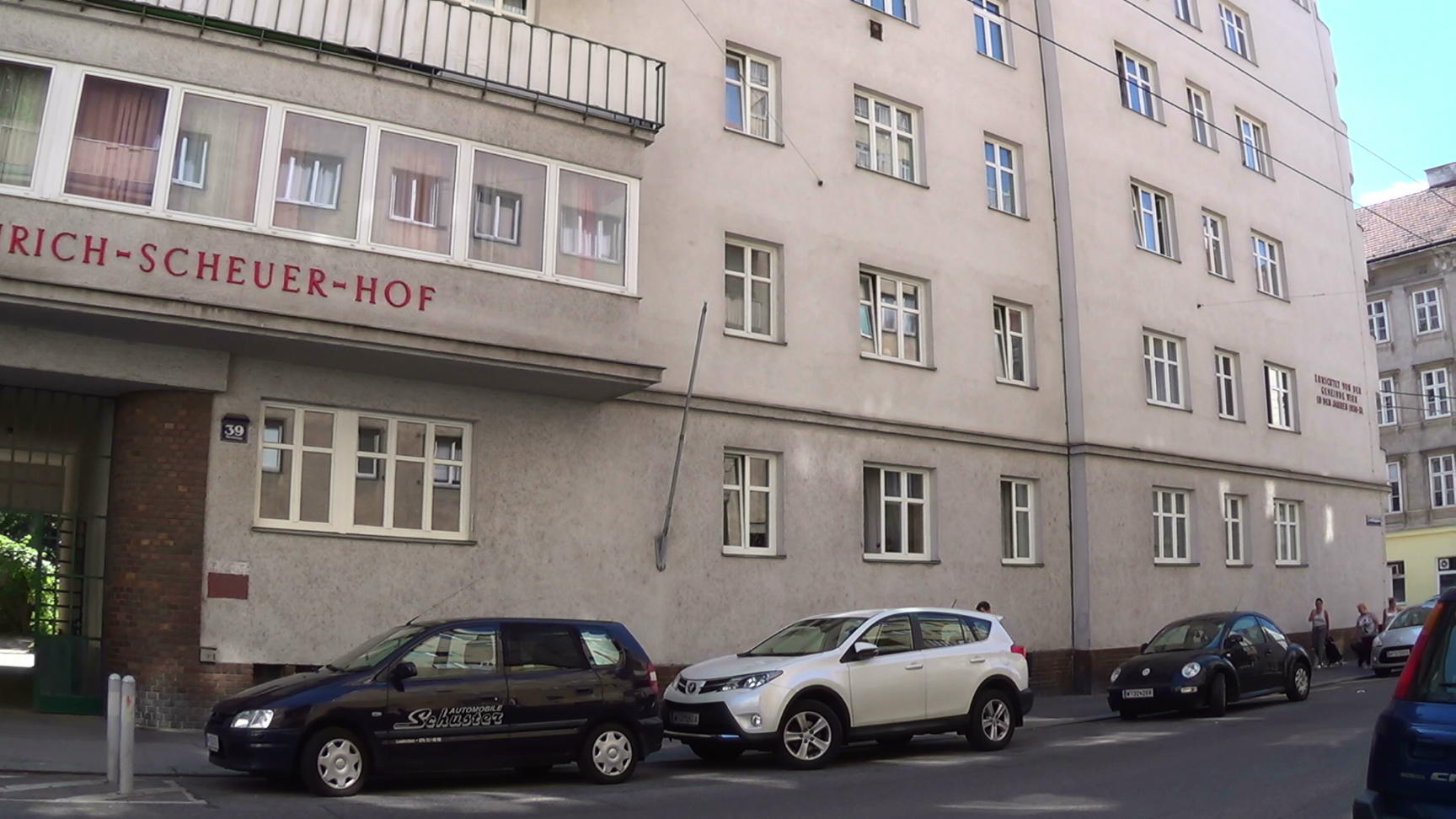 A typical municipality owned housing complex, the Alice-und-Heinrich-Scheuer-Hof in the 3rd district. This is a panorama from the left to the right.