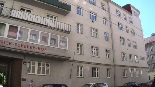 A typical municipality owned housing complex, the Alice-und-Heinrich-Scheuer-Hof in the 3rd district. This is a panorama from the left to the right.
