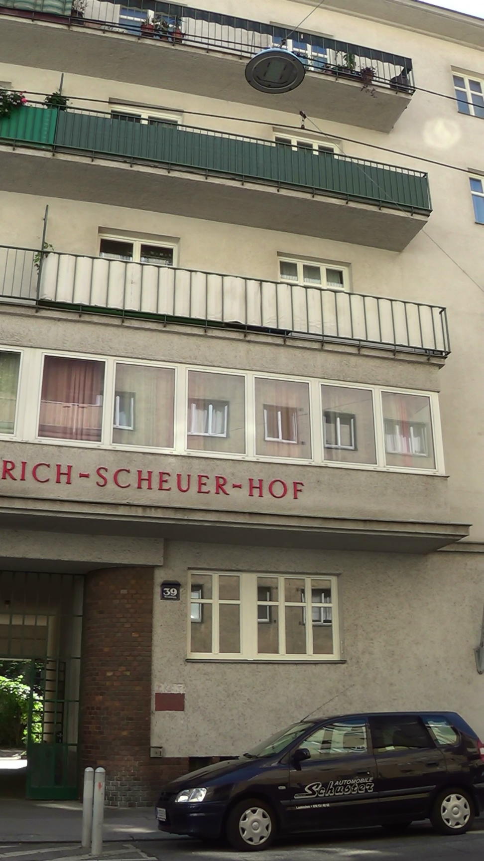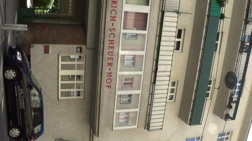A typical municipality owned housing complex, the Alice-und-Heinrich-Scheuer-Hof in the 3rd district. This is a panorama from the left to the right.