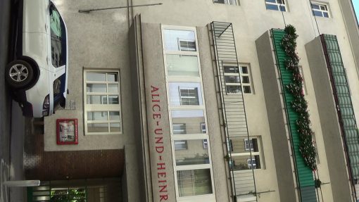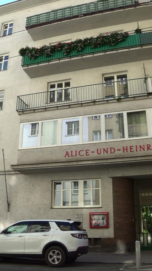 A typical municipality owned housing complex, the Alice-und-Heinrich-Scheuer-Hof in the 3rd district. This is a panorama from the right to the left.