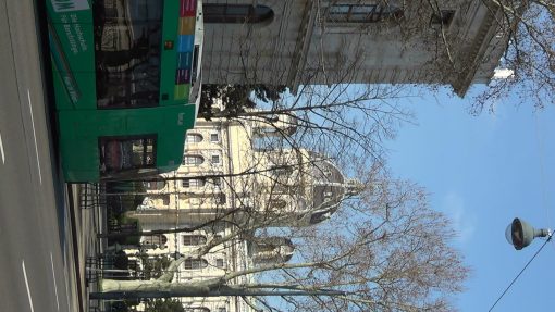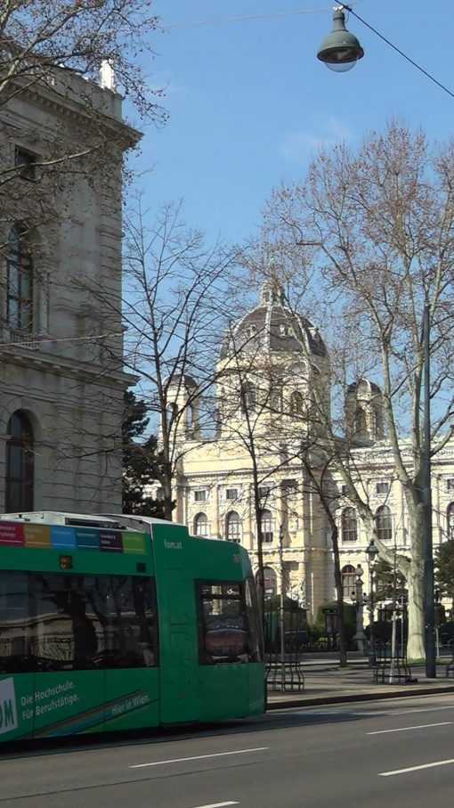 On Ringstraße, looking towards the Natural History Museum. A tram passes, carrying an advertisement in green. This is an ULF (Ultra Low Floor) type train, first delivery in 1997. This take was recorded in the weeks of Covid-19 (Corona virus) lockdown in March 2020, on an otherwise regular workday. Quiet city, little traffic.