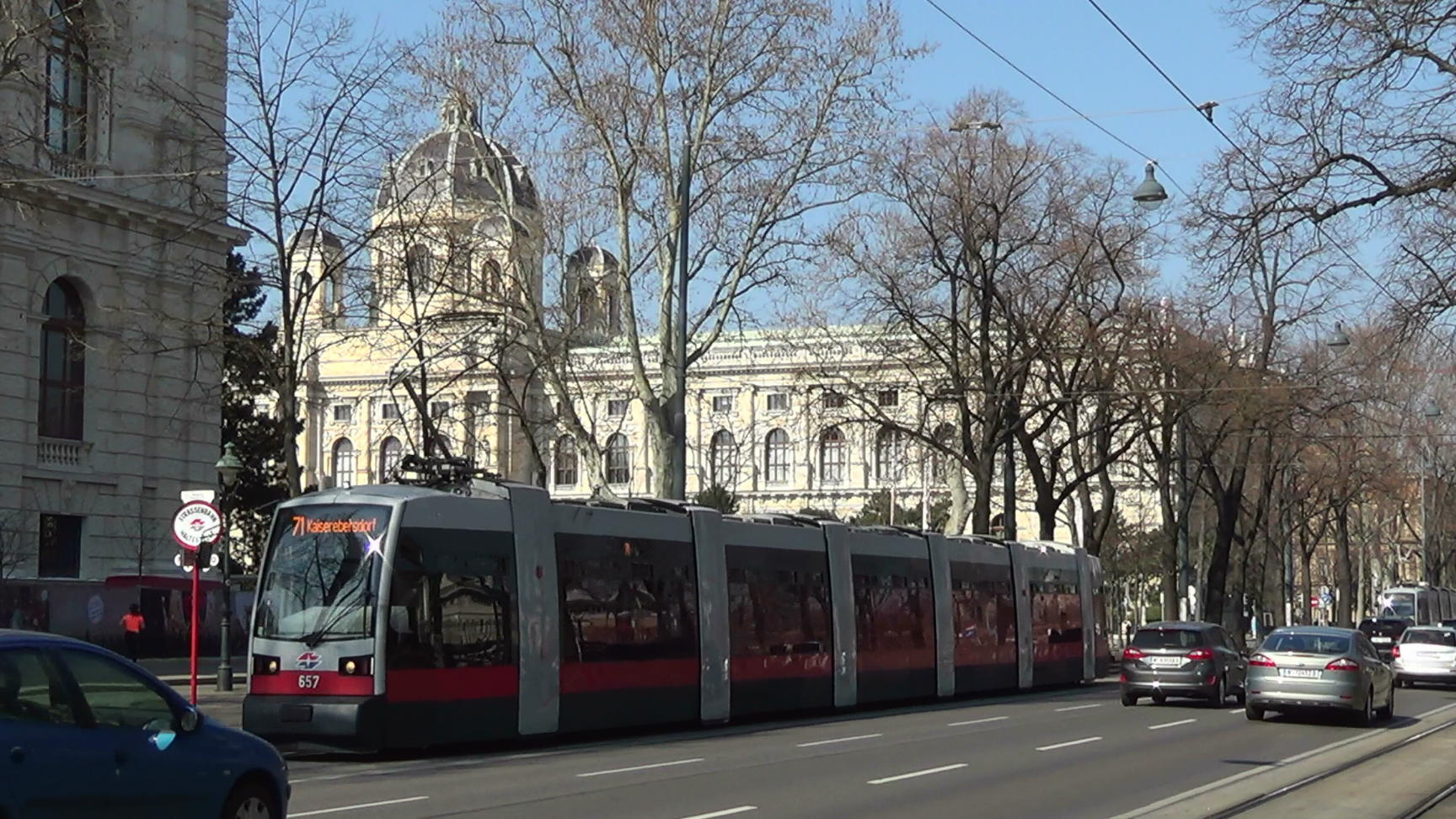 On Ringstraße, looking towards the Natural History Museum. A tram passes. This is an ULF (Ultra Low Floor) type train, first delivery in 1997. This take was recorded in the weeks of Covid-19 (Corona virus) lockdown in March 2020, on an otherwise regular workday. Quiet city, little traffic.