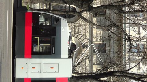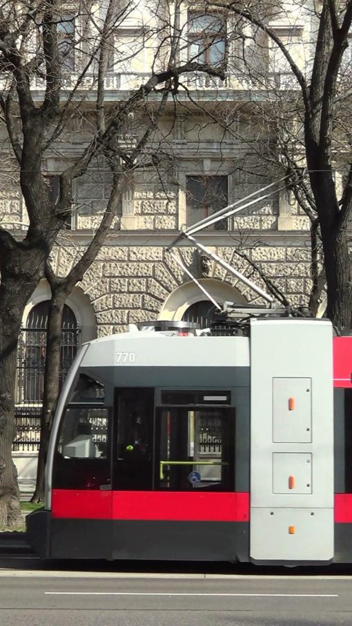 On Ringstraße, looking straight towards a Hofburg facade. A tram passes. This is an ULF (Ultra Low Floor) type train, first delivery in 1997.