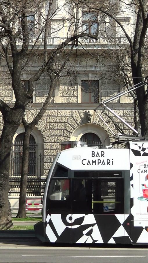 On Ringstraße, looking straight towards a Hofburg street front. A tram with black/white advertisement passes. This is an ULF (Ultra Low Floor) type train, first delivery in 1997.