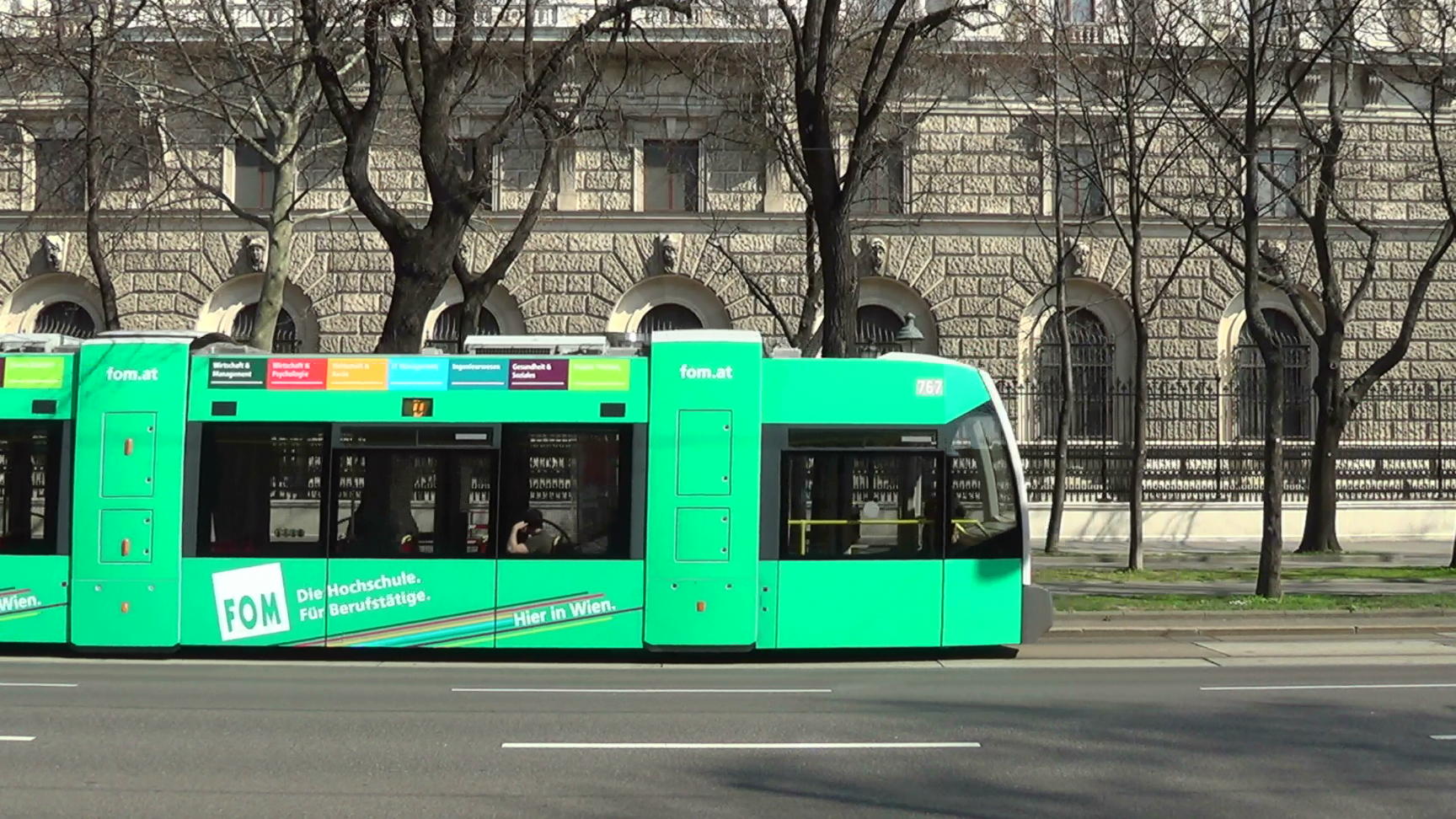 On Ringstraße, looking straight towards the Hofburg street front. A tram with green advertisement passes. This is an ULF (Ultra Low Floor) type train, first delivery in 1997.