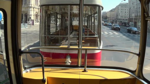 In an old Viennese tram, view through the rear window of the motor car. Motor cars of this type are E2, trailers are e2. Delivery between 1978 and 1990. See the Vienna Opera House on the left hand side. Few passengers, little street traffic. This take was recorded in the weeks of Covid-19 (Corona virus) lockdown in March 2020, on an otherwise regular workday.