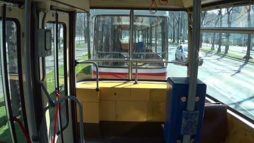 In an old Viennese tram, view through the rear window of the motor car. Motor cars of this type are E2, trailers are e2. Delivery between 1978 and 1990. Few passengers, little traffic. This take was recorded in the weeks of Covid-19 (Corona virus) lockdown in March 2020.