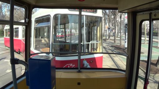 In an old Viennese tram, view through the rear window of the motor car. Motor cars of this type are E2, trailers are e2. Delivery between 1978 and 1990. Few passengers, little traffic. This take was recorded in the weeks of Covid-19 (Corona virus) lockdown in March 2020.