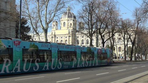 On Ringstraße, looking towards the Natural History Museum. A tram with green advertisement passes. This is an ULF (Ultra Low Floor) type train, first delivery in 1997. This take was recorded in the weeks of Covid-19 (Corona virus) lockdown in March 2020, on an otherwise regular workday. Quiet city, litte traffic.