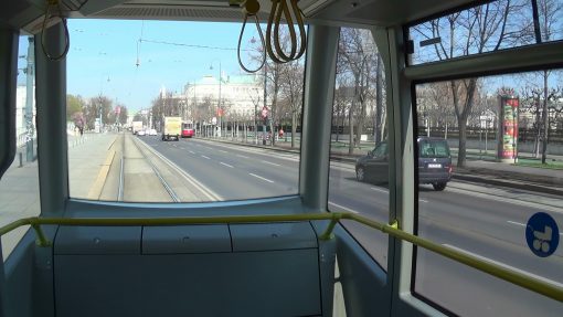 In a Viennese tram, view through the rear window. Burgtheater in the distance. This is an ULF (Ultra Low Floor) type train, first delivery in 1997. Quiet city, few passengers, little traffic. This take was recorded in the weeks of Covid-19 (Corona virus) lockdown in March 2020, on an otherwise regular workday.