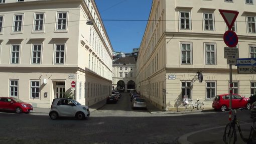 Dr. Sigmund Freud (Bruno Ganz) and Franz Huchel (Simon Morze) talk under these arches in the austrian cinema movie “Der Trafikant” (2018). The movie home of Dr. Freud is the house in the niche far left, the building is invisible from here.