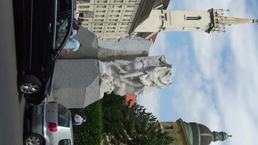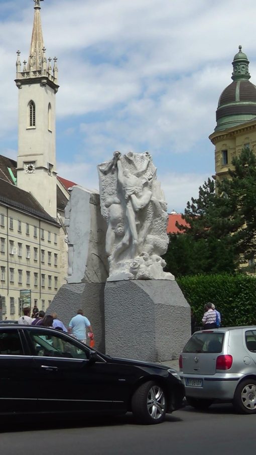 Innere Stadt, the “Monument Against War and Fascism”. The two large white blocks “War” and “Holocaust” build the “Gate of Violence”. Behind them, invisible from here, the “Kneeling Jew”. The Old Town of Vienna is UNESCO World Cultural Heritage Site.