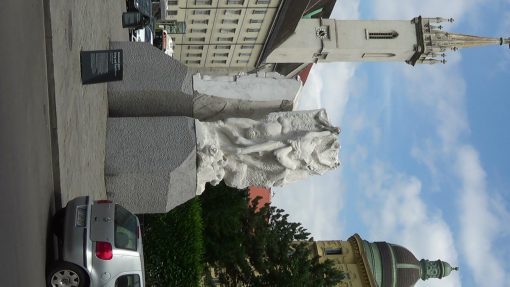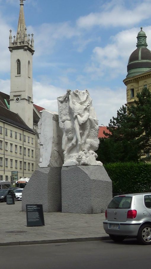 Innere Stadt, the “Monument Against War and Fascism”. The two large white blocks “War” and “Holocaust” build the “Gate of Violence”. Behind them, invisible from here, the “Kneeling Jew”. The Old Town of Vienna is UNESCO World Cultural Heritage Site.