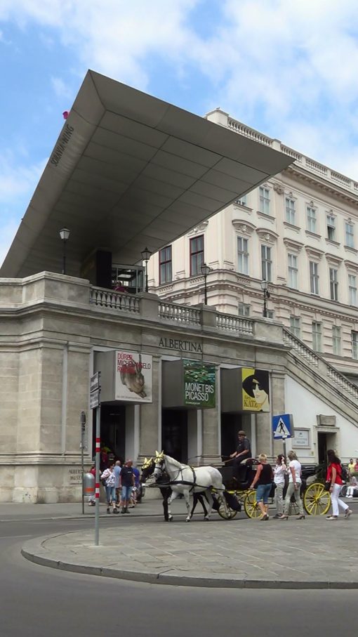 Innere Stadt, on Helmut-Zilk-Platz. This is the “Soravia Wing” and the main entrance to the Albertina Museum. The Monument against War and Fascism is quite nearby, to the right of the camera. The Innere Stadt (Old Town) of Vienna is UNESCO World Cultural Heritage Site.