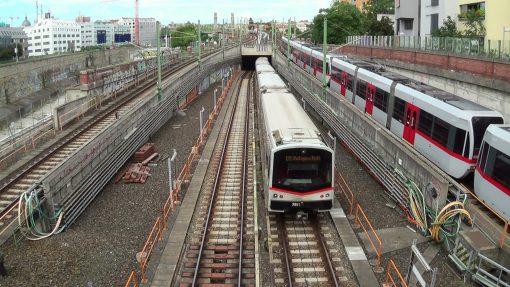 Viena, Austria. Día soleado de verano. Las líneas de metro U4 y U6 confluyen en la estación “Längenfeldgasse”, Längenfeldgasse se encuentra a medio camino entre el centro de la ciudad y el Palacio de Schönbrunn.