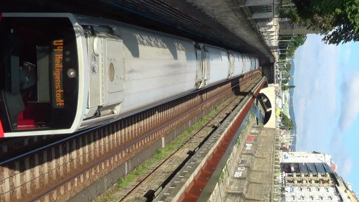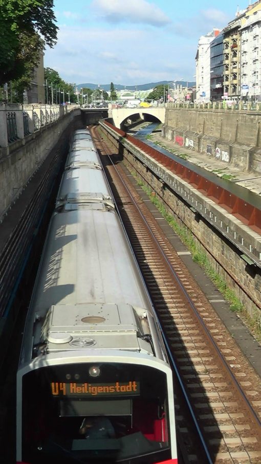 The subway line U4 going eastwards (approaching the camera position), between the stations Schönbrunn and Pilgramgasse. This is a V type train, first delivery in 2000.