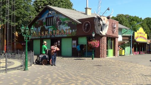 Wurstelprater, the amusement park in the Wiener Prater area. On a summer morning, the first attractions are about to open.