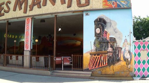 Wurstelprater, the amusement park in the Wiener Prater area, on an early summer morning. This is a panorama from the right to the left, over an old fashioned wild west train attraction.