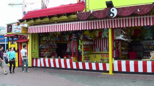 Wurstelprater, the amusement park in the Wiener Prater area. On a summer morning, the first attractions are about to open. This is a panorama from the left to the right.