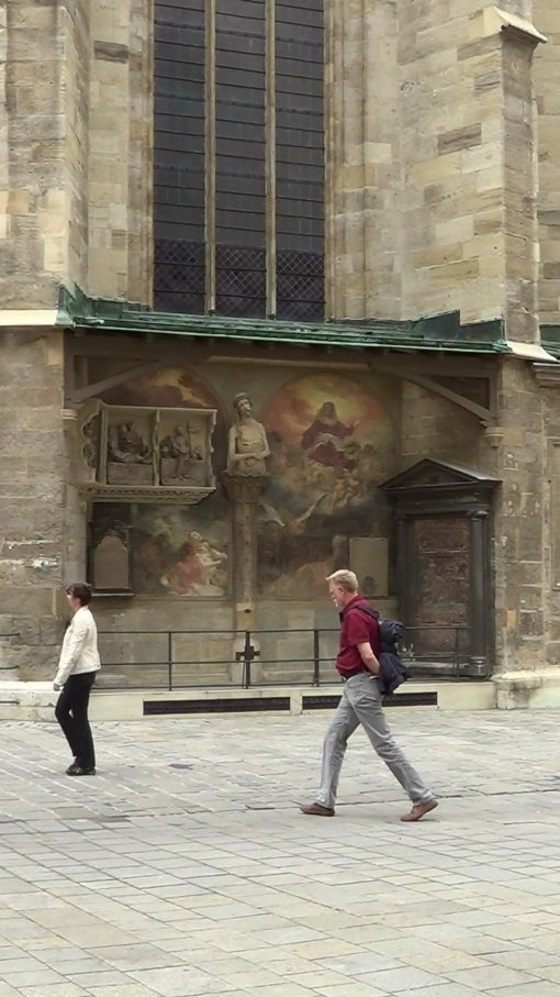 Just behind the St. Stephens Cathedral in the Innere Stadt, the old town lanes become narrower and darker. This is Zahnweh-Herrgott, the “Good God of Toothake” on the wall of the cathedral. The old town of Vienna is UNESCO World Cultural Heritage Site.