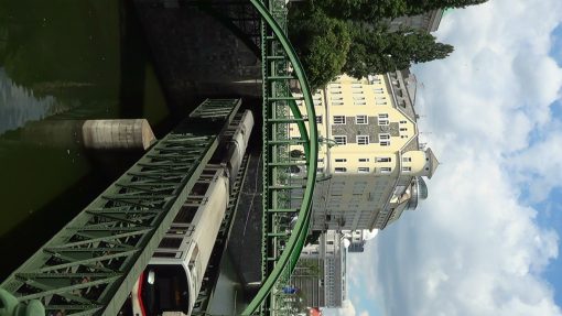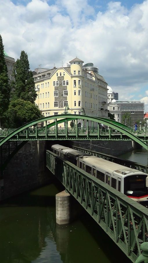 Zollamtbrücke (Customs Office Bridge) is a small steel bridge for pedestrians to cross the shallow Wien river and the subway line U4. A subway train passes, approaching the camera position.