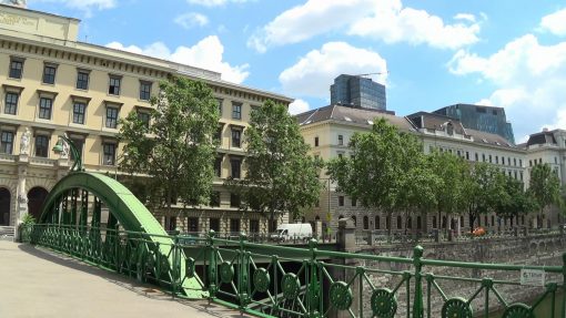 Zollamtbrücke (Customs Office Bridge) is a small steel bridge for pedestrians to cross the shallow Wien river and the subway line U4.Panorama from the left to the right.
