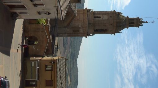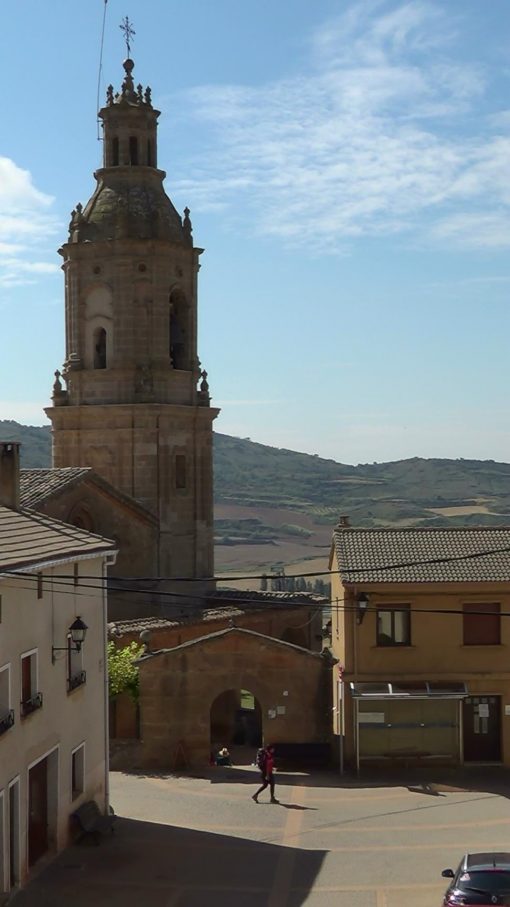 On the Camino de Santiago (St. James Trail) between Estella and Los Arcos in the province of Navarra. Pilgrims in the village. The Camino de Santiago ist UNESCO World Cultural Heritage.