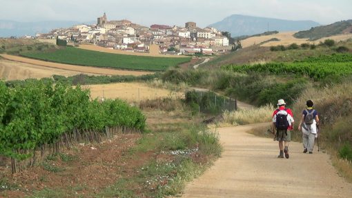 On the Camino de Santiago (St. James Trail). Pilgrims on their way to Cirauqui. Cirauqui is a village between Puente la Reina and Lorca. This film is closer to the village than film no. 81126 and film no. 81427. The Camino de Santiago is UNESCO World Cultural Heritage.