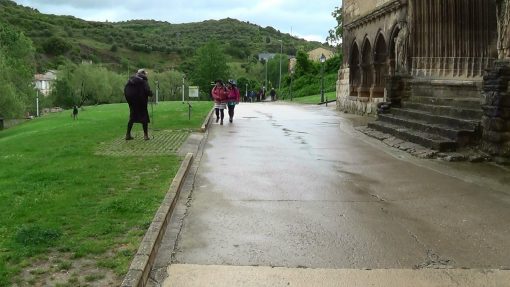 On the Camino de Santiago (St. James Trail). On the way into Estella, Pilgrims pass the Santo Sepulcro Church.