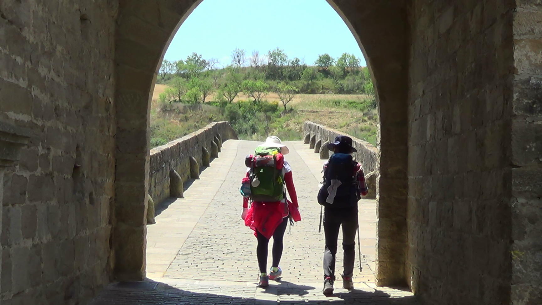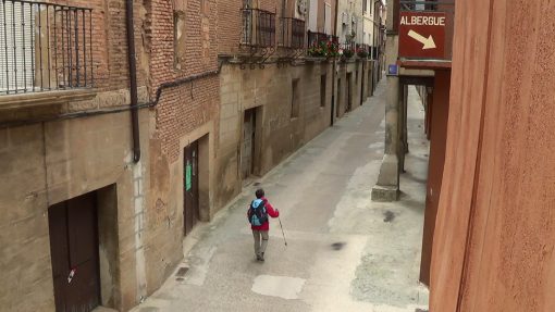 On the Camino de Santiago (St. James Trail). Los Arcos is a pueblo located between Estella and Logrono. A pilgrim walks through the village.