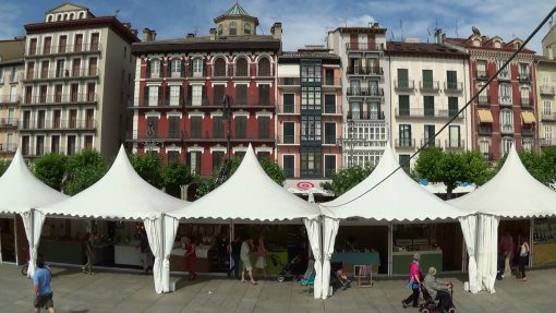 Plaza del Castillo in the Old Town, the locals start into their market day. Beautiful spanish architecture background. Pamplona is a city on the Camino de Santiago (St. James Trail). Famous for the annual San Fermin Encierro (Running of the Bulls).