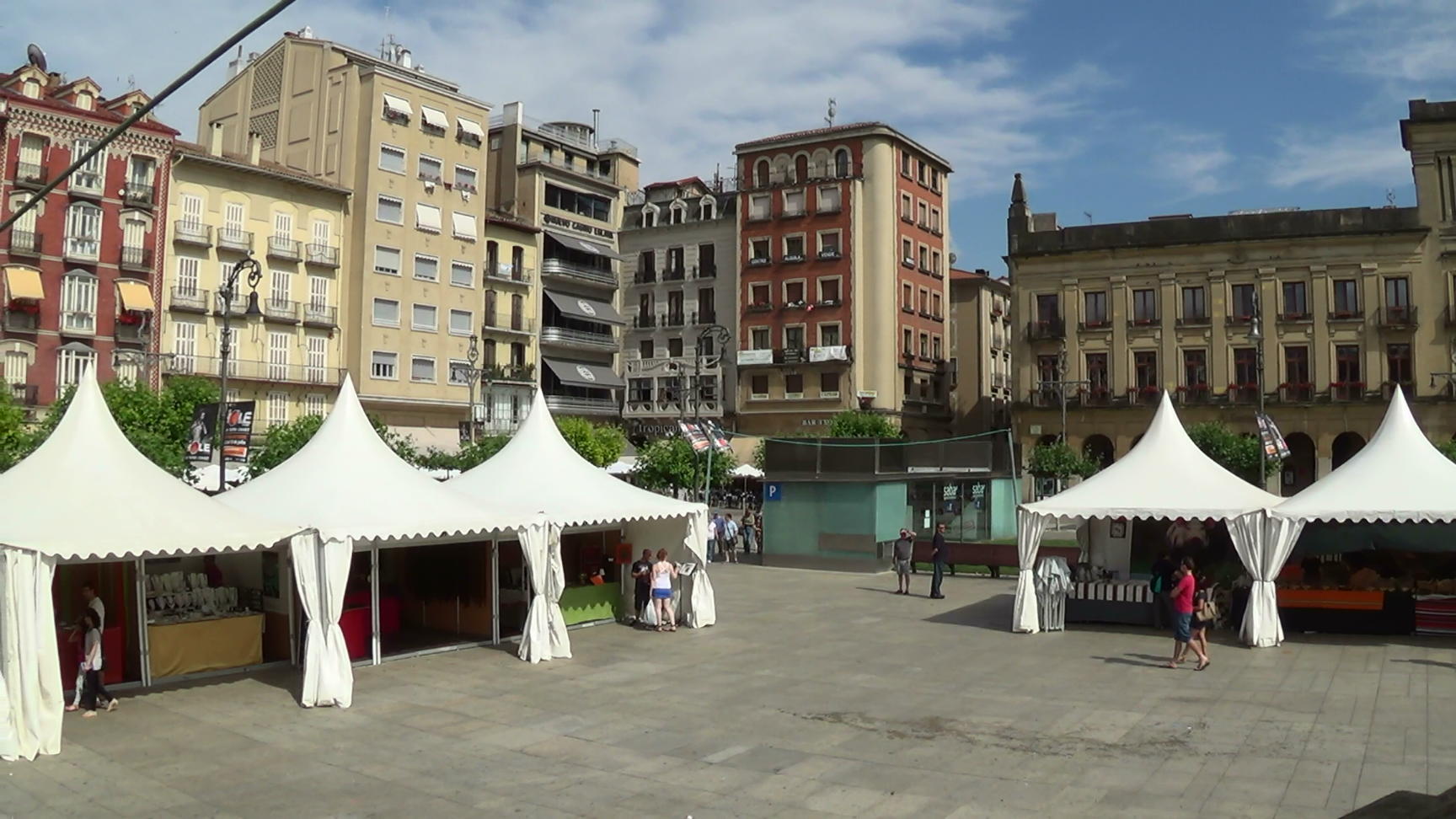 Plaza del Castillo, seen from the music kiosk. The locals prepare for their market day. This is a panorama from the right (Calle de Espoz y Mina) to the left (Hotel La Perla, Cafe Iruna). Pamplona is a city on the Camino de Santiago, famous for the annual San Fermin Encierro (Running of the Bulls). The Camino de Santiago is UNESCO World Cultural Heritage.