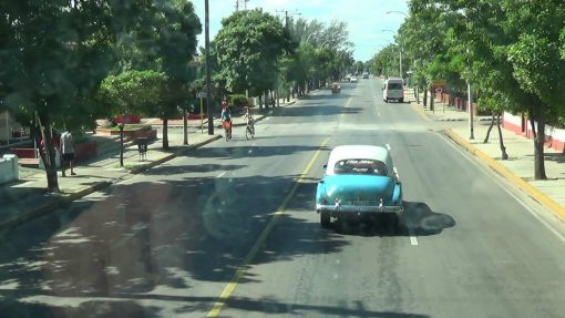Traffic on Avenida Primera, seen through the upper deck windshield of the hopon/hopoff bus.