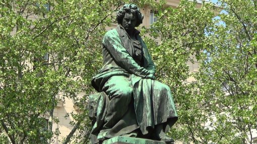 The Ludwig van Beethoven statue at Beethovenplatz (Beethoven Square). Leaves move in the wind.