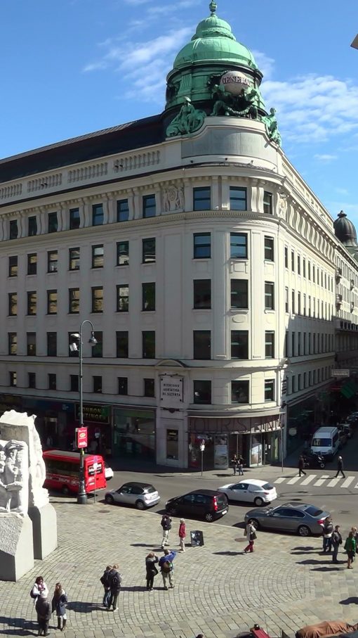 Innere Stadt (Old Town), the former Vienna headquarter of the Assicurazioni Generali, an insurer founded back at a time the Austrian Empire was connected to the mediterranean sea. The War and Fascism/Holocaust Monument is right in front of it. The Old Town of Vienna is UNESCO World Cultural Heritage Site.
