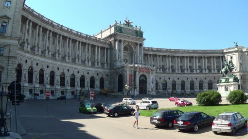 The main entrance to the Austrian National Library at Heldenplatz (Hero Square). In front of the door stands the monument of Archduke Karl. UNESCO World Cultural Heritage Site. Heldenplatz is often the finish zone of the annual Vienna City Marathon.