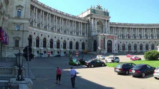 Heldenplatz (Hero Square), the two monuments of Archduke Karl and Prince Eugene of Savoy, and the Austrian National Library. This is a panorama from the left to the right.  Heldenplatz is often the finish zone of the annual Vienna City Marathon.